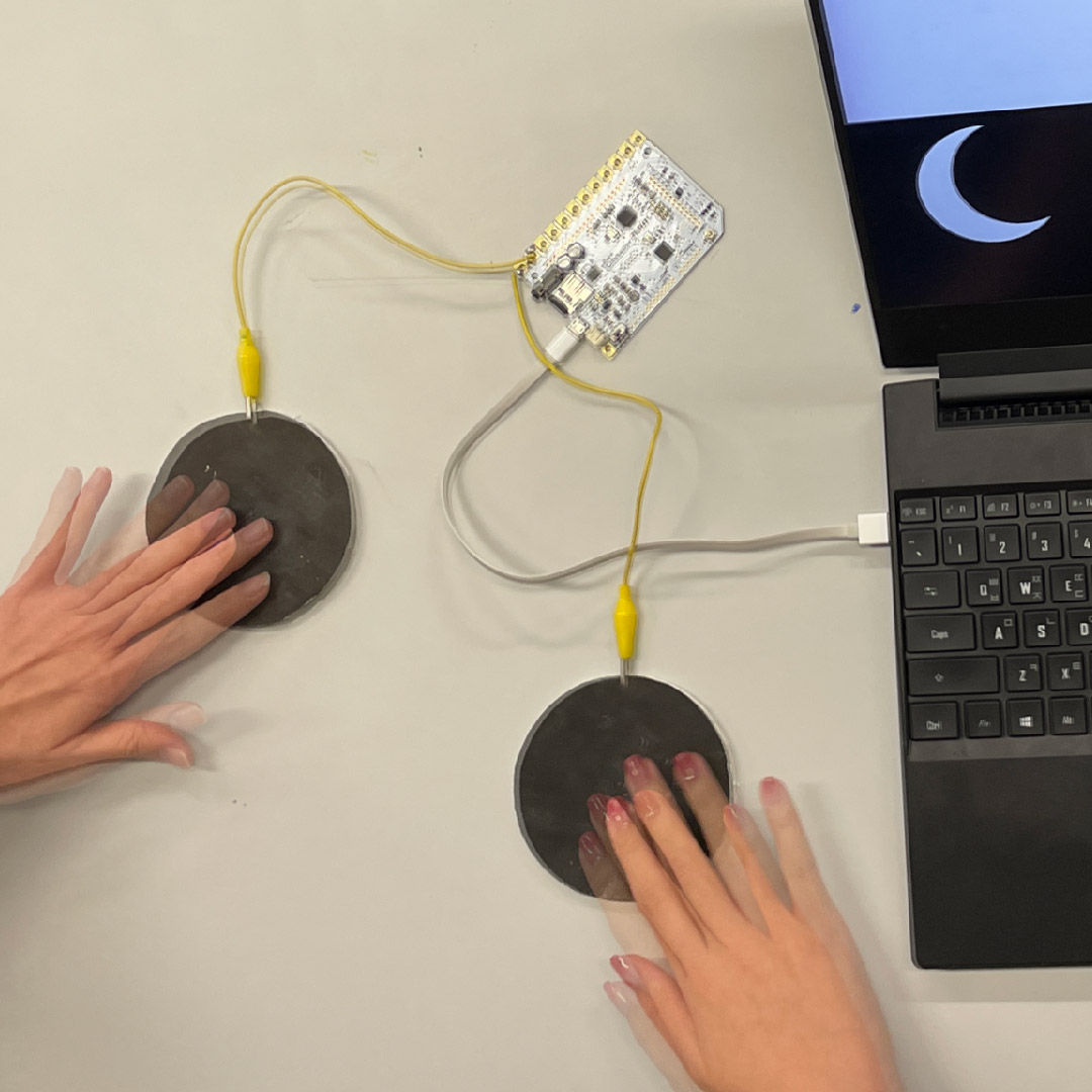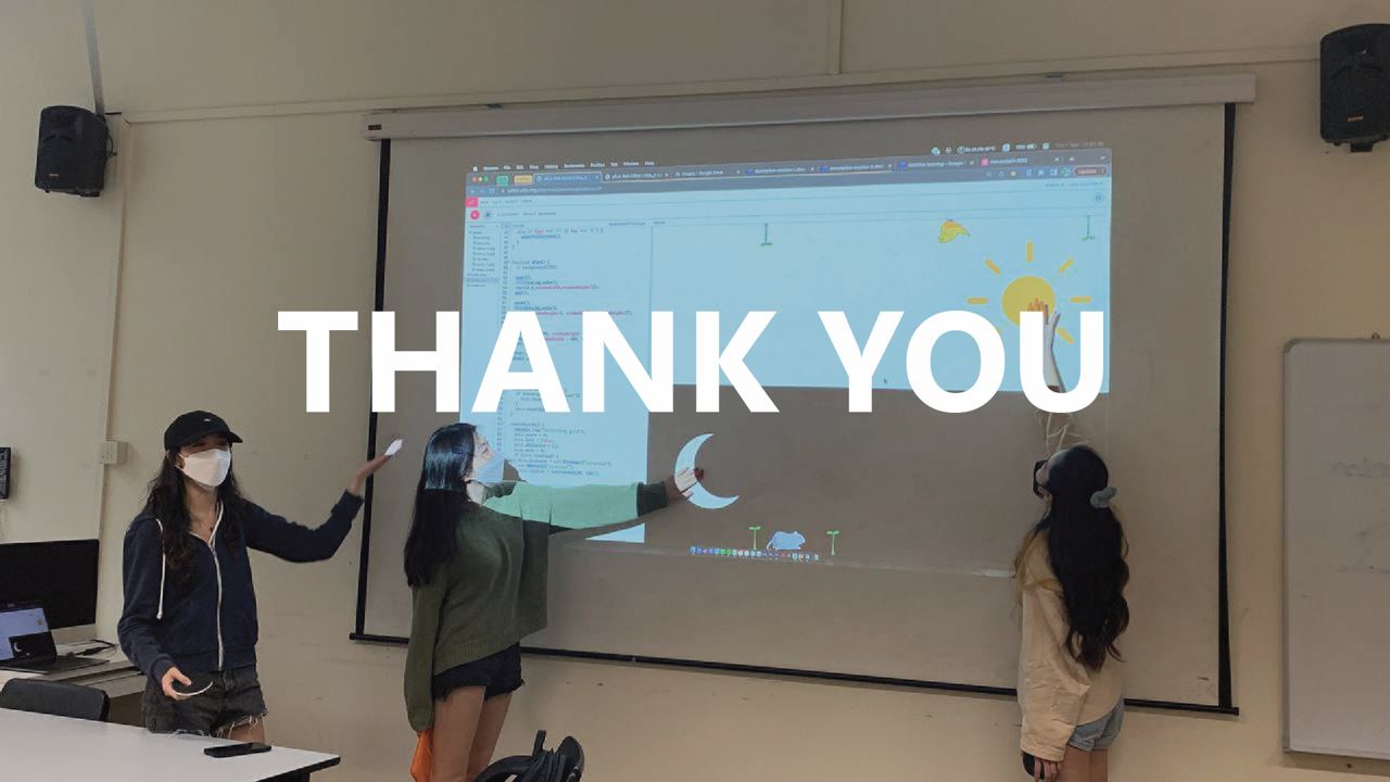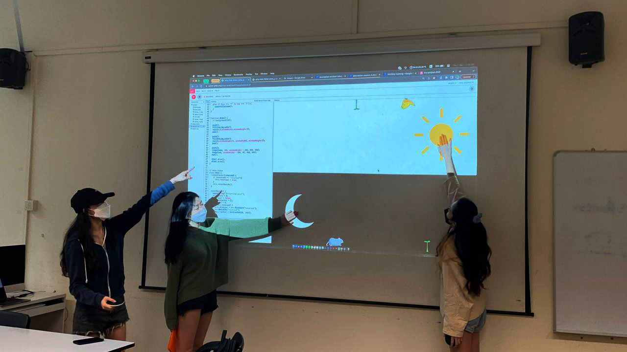 The third project is Day & Night. The idea is inspired by the cycle of day and night. We created a game where a bird (representing sun) and a rat (representing moon) avoid obstacles by jumping. Users can control each character by touching buttons, utilising the micro-controller connected to P5js, and view the game on a wall, using the projector.