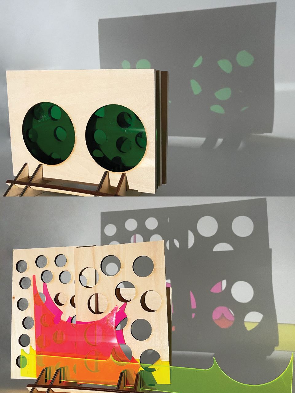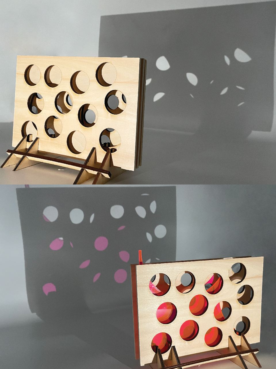 The second project is Solar silhouette. The idea is inspired by how sunlight travels through space and through various obstacles before reaching the Earth. By laser cutting random circles of different sizes into wood and shining lights through them, we created different and interesting shadows.