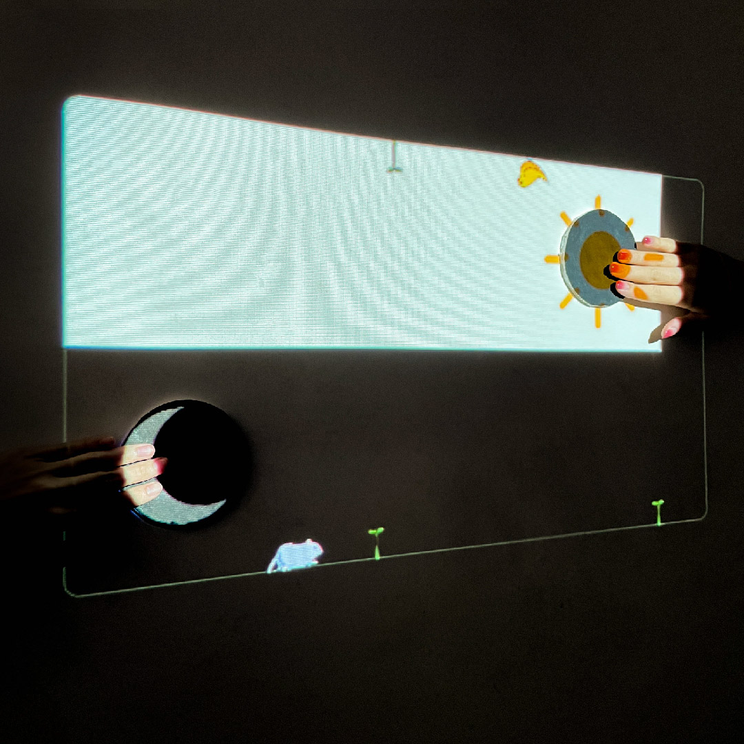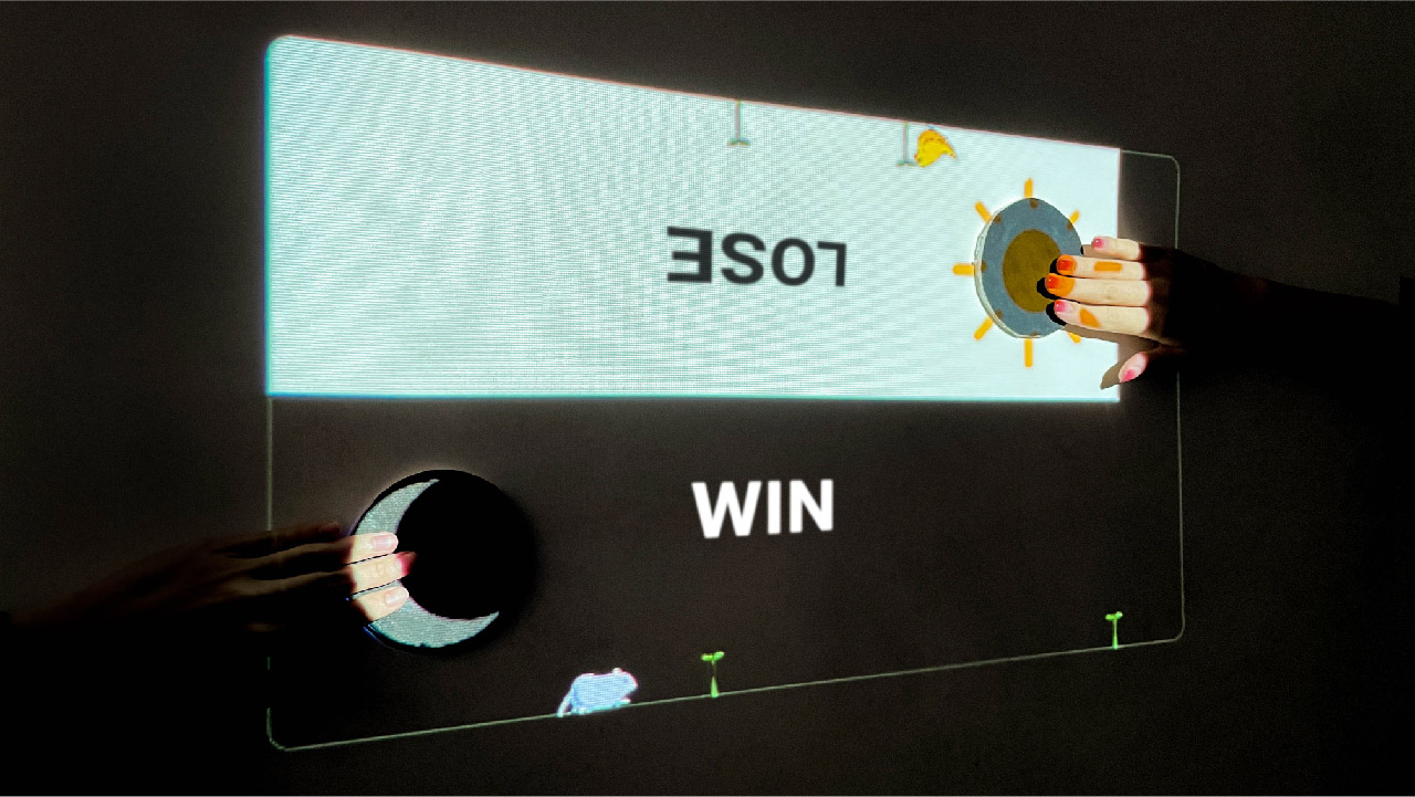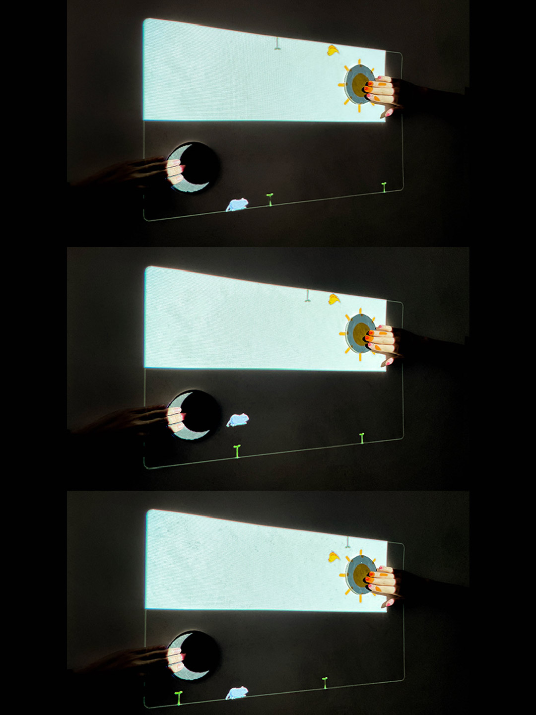 Our group hoped that people could become a part of the work through the simple act of ‘touching’ using a touch board and projection. The number of possible inputs was limited to two, and we aimed to create effective results with simple inputs. There are several phenomena that come to mind when thinking of the sun, and they are as follows.