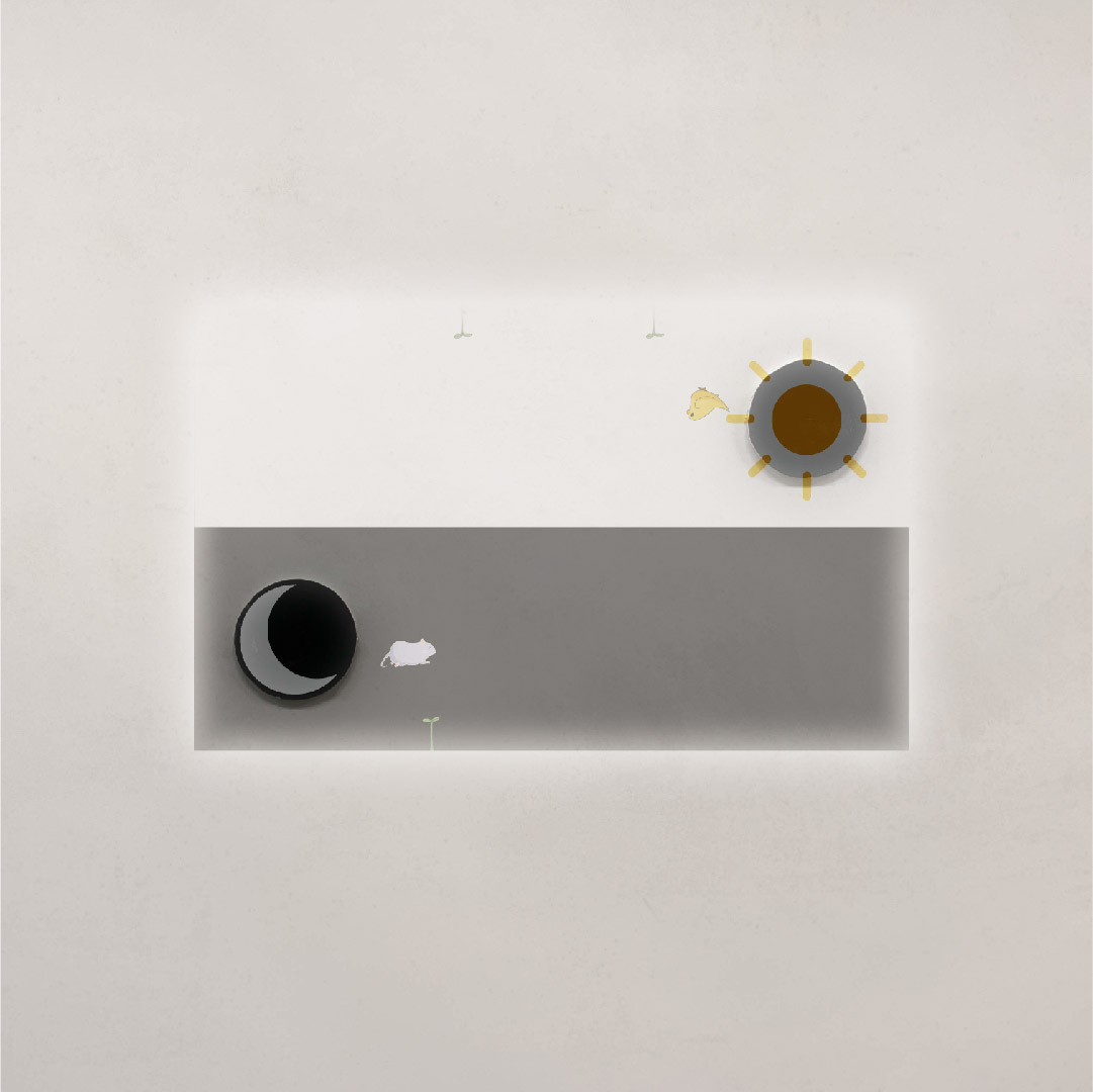 The project is a two-player battle game that simultaneously transmits backgrounds of two themes under the theme of day and night. The background of the game uses white and black to express light and shadow effectively, and the colors and shapes of the sun and moon are also designed to be simple, showing an intuitive connection to the theme of 'sun'. Users can control each character by touching the button that represents ‘sun and moon’, and share the goal of avoiding obstacles approaching the character at random intervals. The game ends when one of the two characters touches an obstacle.